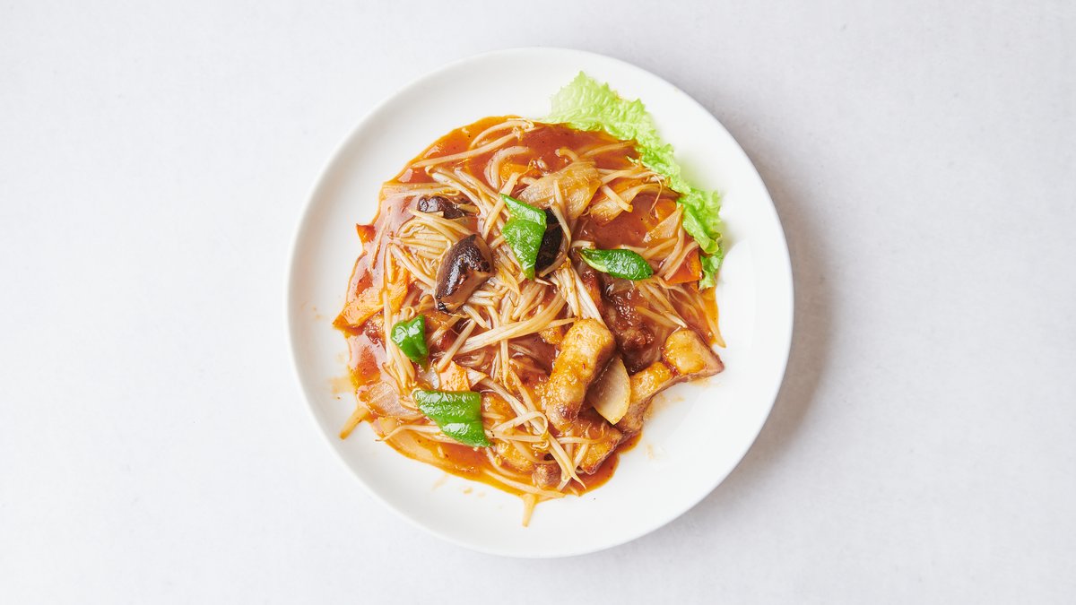 ピリ辛の酸辣ソースがかかった、スパイシーな豚肉の炒め物です。