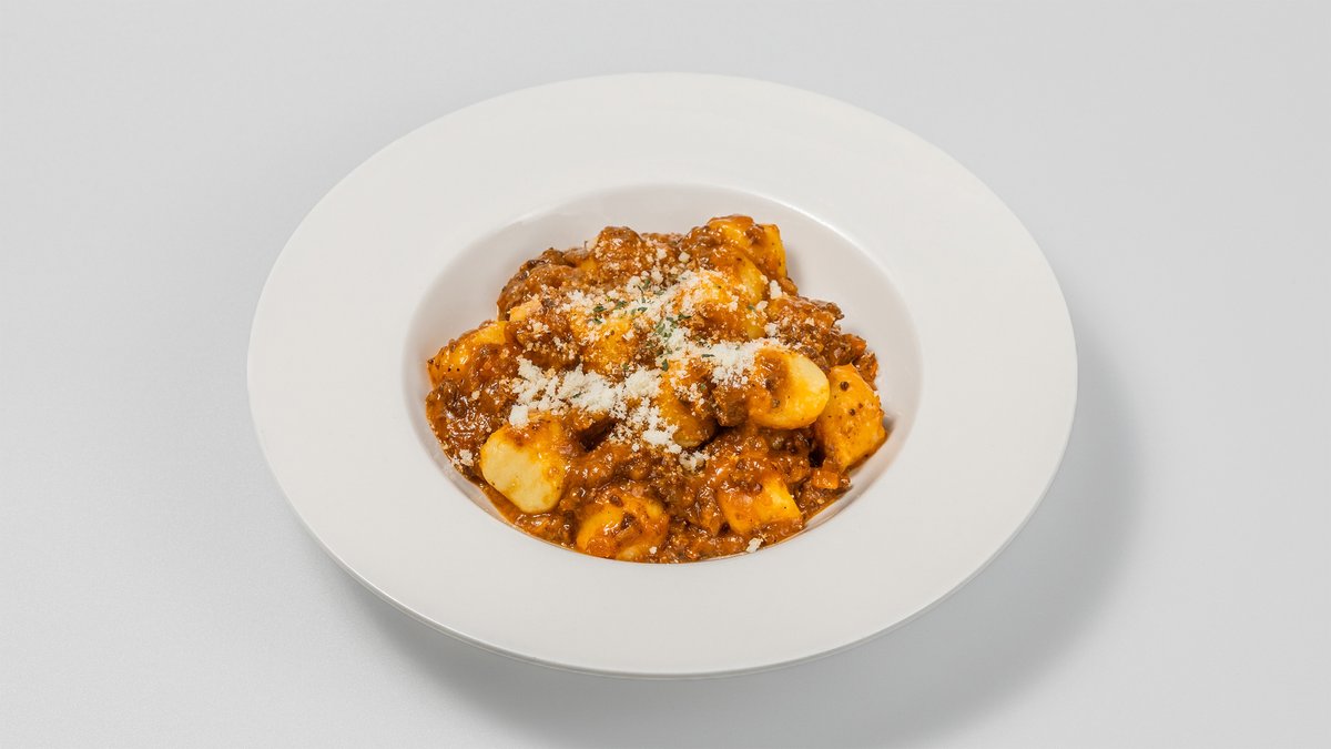 もちもち食感のニョッキにコク深い自家製ミートソースをたっぷりかけた一皿です。