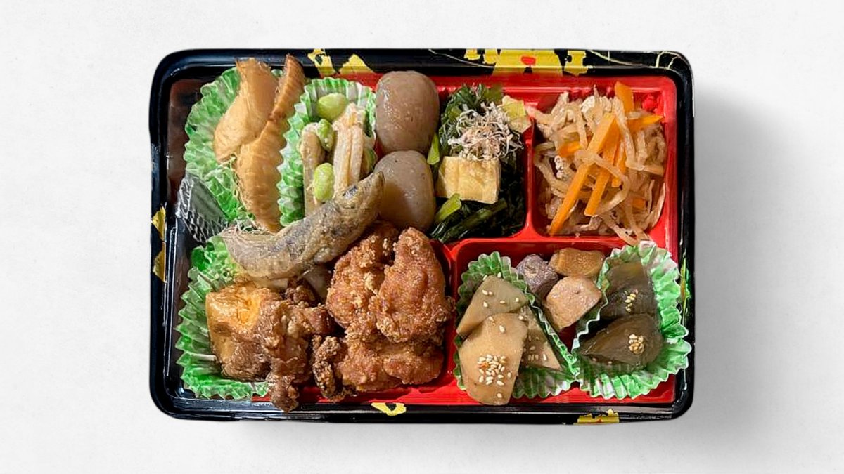 次郎長で人気の「日替わりおばんざい」定番人気の神楽のタレ仕込みの大きな唐揚げ3つ付いた、大満足のお弁当です!揚げ物はドクターフライで揚げてるのでカロリーオフ!出前でも健康的な食事を…。180gのご飯付き。大盛りは+200円です。