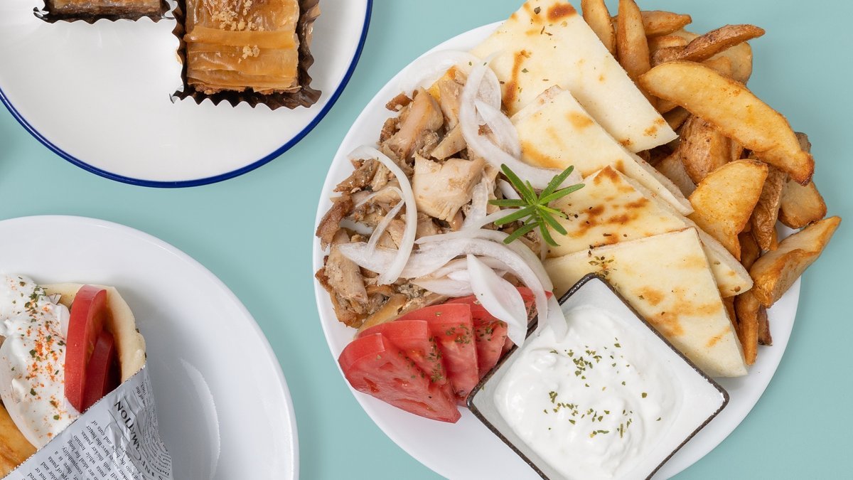 チキン&ポークギロス、チキン&ポークスヴラキ、ビーフケフテ、フライドポテト、トマト、玉ねぎ、自家製タジキソース、ピタパンorライスのプレートです。