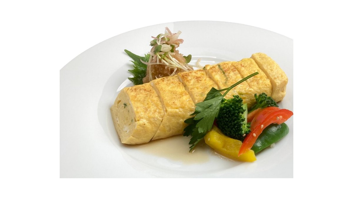 当店のお弁当のレギュラーメニュー。玉子は3個分です。 お弁当では冷まして使いますが、ここでは焼きたての温かいうちに召し上がっていただくためのメニューです。