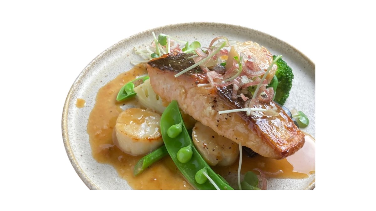 皮を香ばしく焼いたムニエルに、ゆず風味の和風ソースを絡めた帆立を添えます。