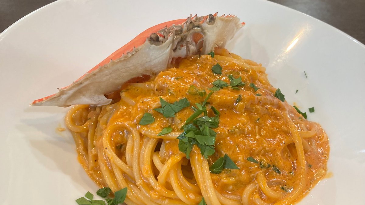 渡り蟹の出汁とトマトクリームの濃厚なソース。添えたハサミ以外の身は丁寧に取り出してあります。