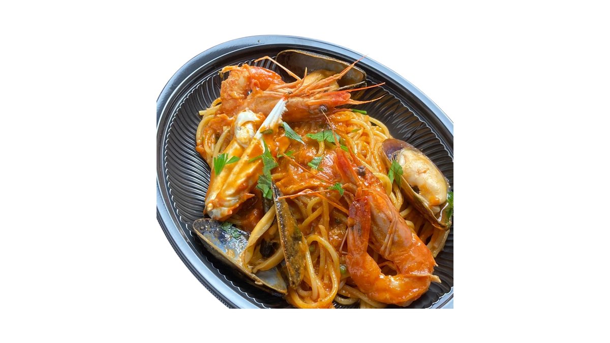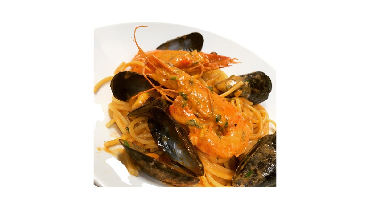 帆立、海老、ムール貝、白身魚など豪快で贅沢なトマトクリーム仕立て。