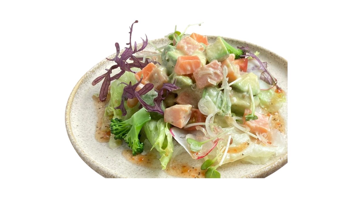 五目野菜に、定番のサーモンとアボガドをカットして添えました。 バジルソースのマリネ仕立。