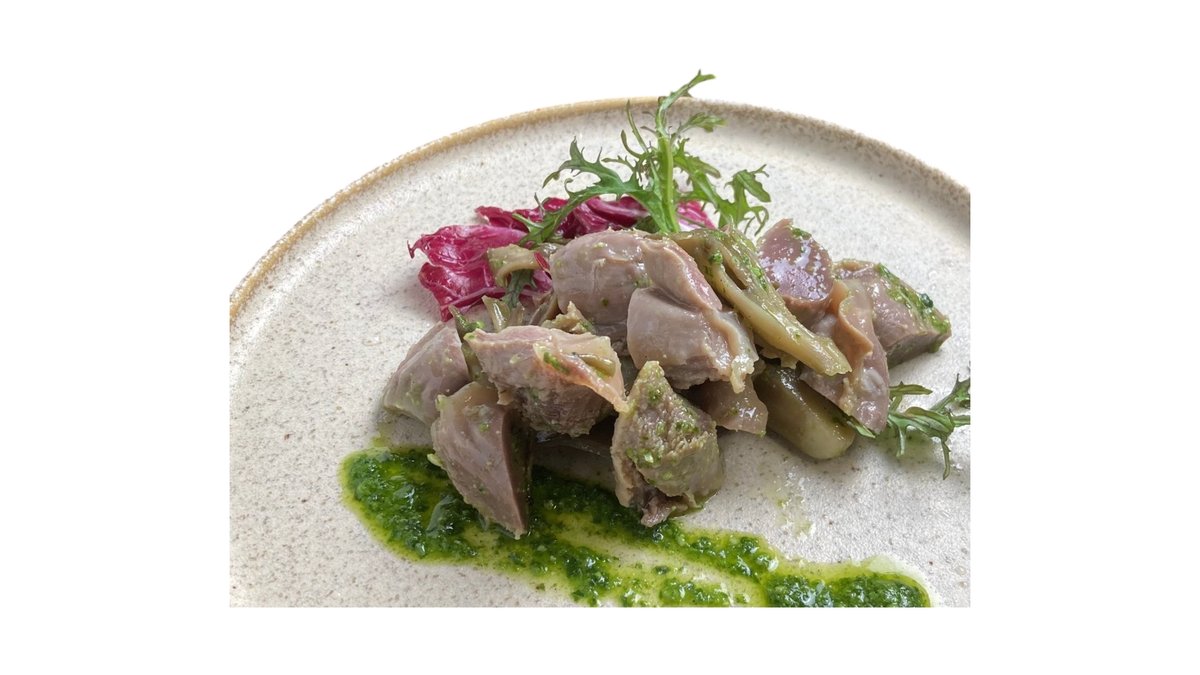 チキンレッグは2日間マリネした後、オイルの中で柔らかく低温調理してあります。提供時に皮目をパリッと焼きあげてトッピングします。