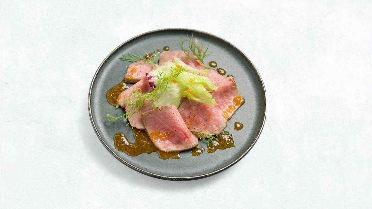 しほろ牛もも肉を丁寧に火入れしました。特製のおろし野菜ソースで、サラダと一緒にお召し上がりください。