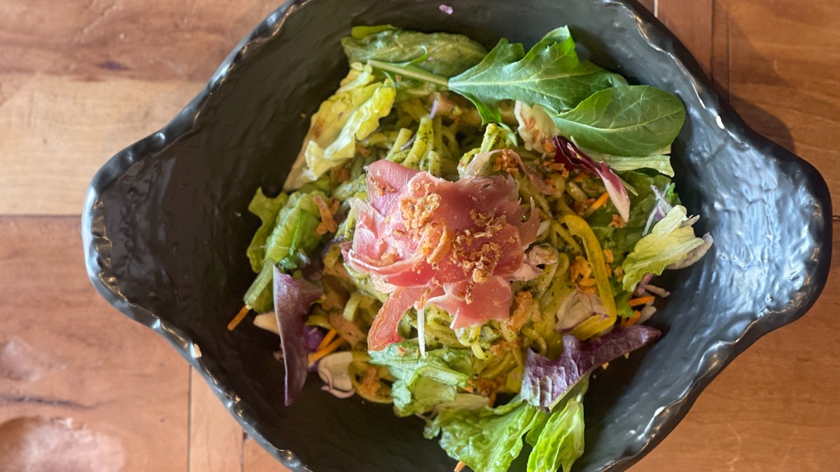 熟成された生ハムを贅沢に乗せたジェノベーゼパスタ