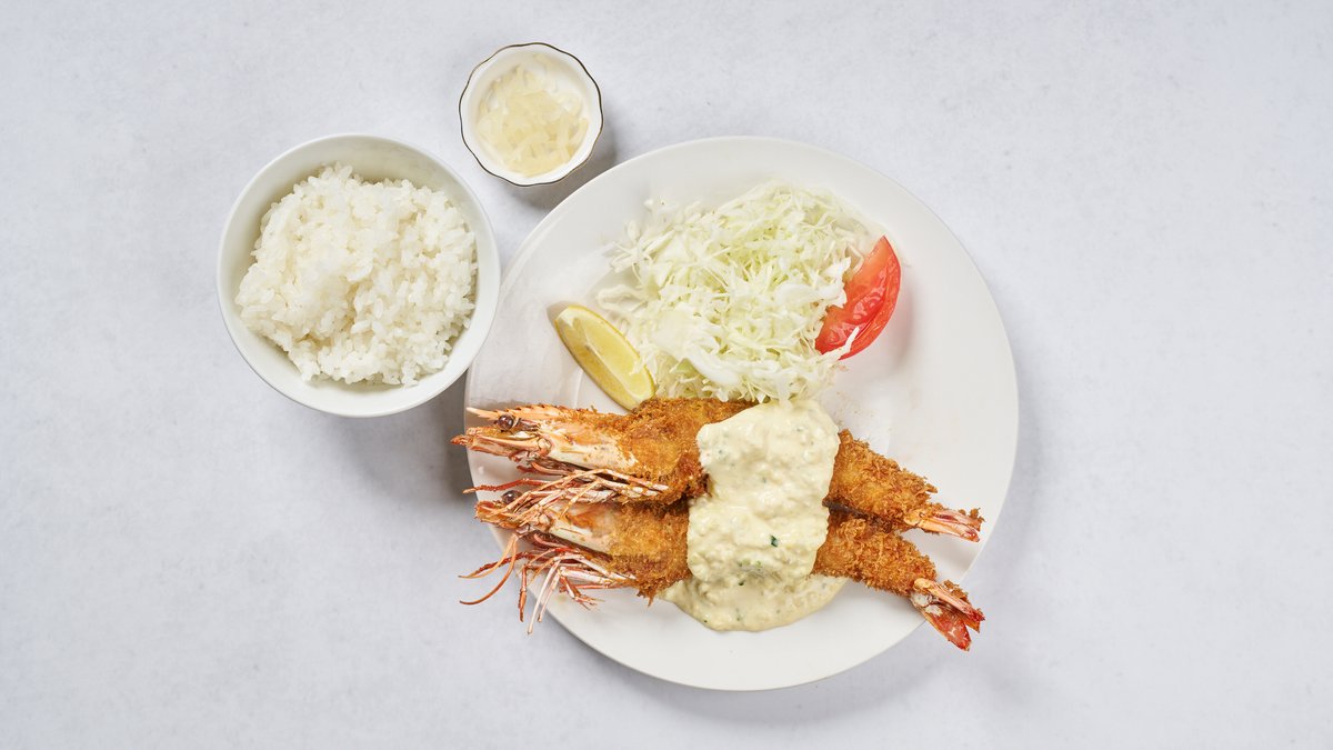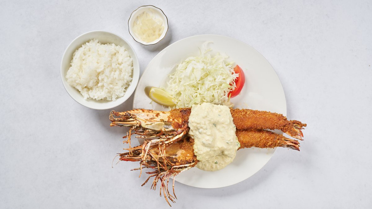 希少価値の高い大型の有頭シータイガーを使用したエビフライ2尾のセットです。 エビフライ2尾と、ご飯・サラダ・漬物がつきます。