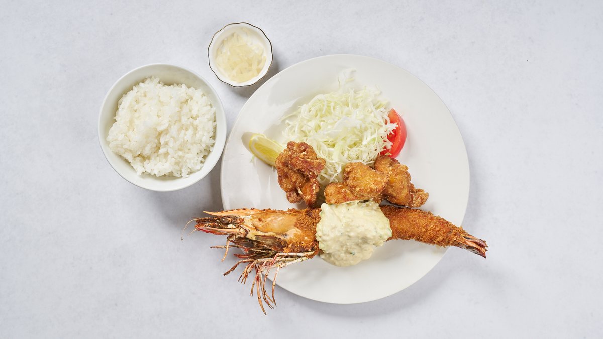 希少価値の高い大型の有頭シータイガーを使用した、中でも特に大きいエビフライと、からあげのセットです。 大きなエビフライ1尾とからあげ、ご飯・サラダ・漬物がつきます。