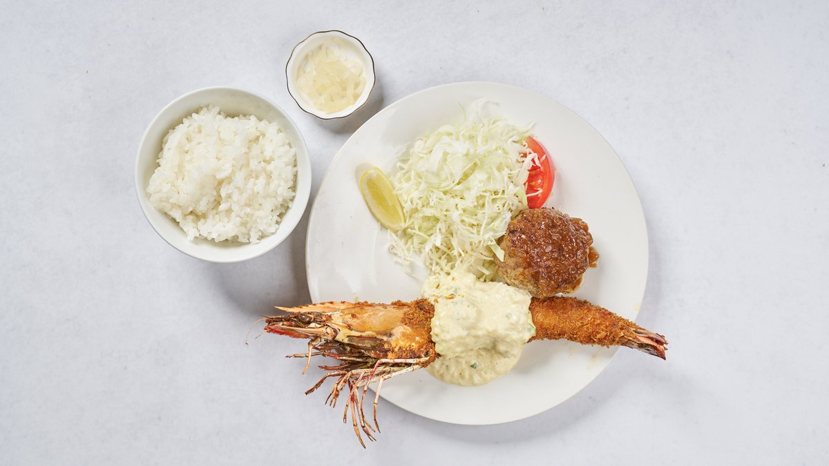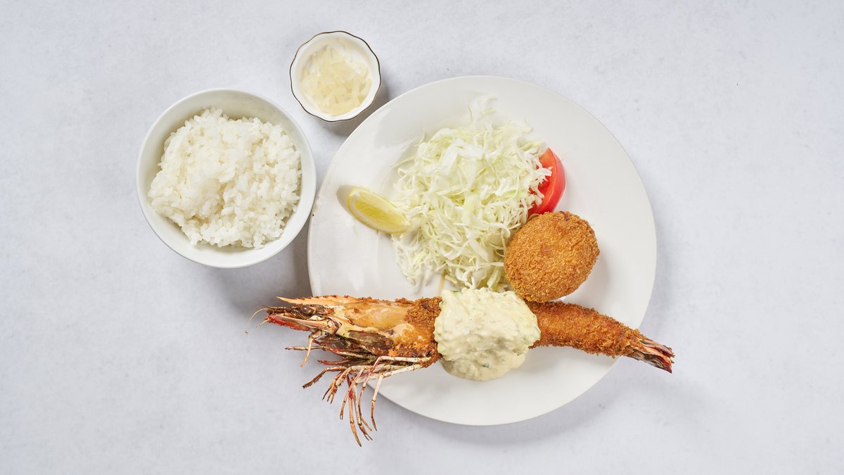 希少価値の高い大型の有頭シータイガーを使用した、中でも特に大きいエビフライと、赤エビのガラから抽出したエビソースとクリームを混ぜ合わせたコロッケのセットです。 大きなエビフライ1尾とエビ入りクリームコロッケ、ご飯・サラダ・漬物がつきます。