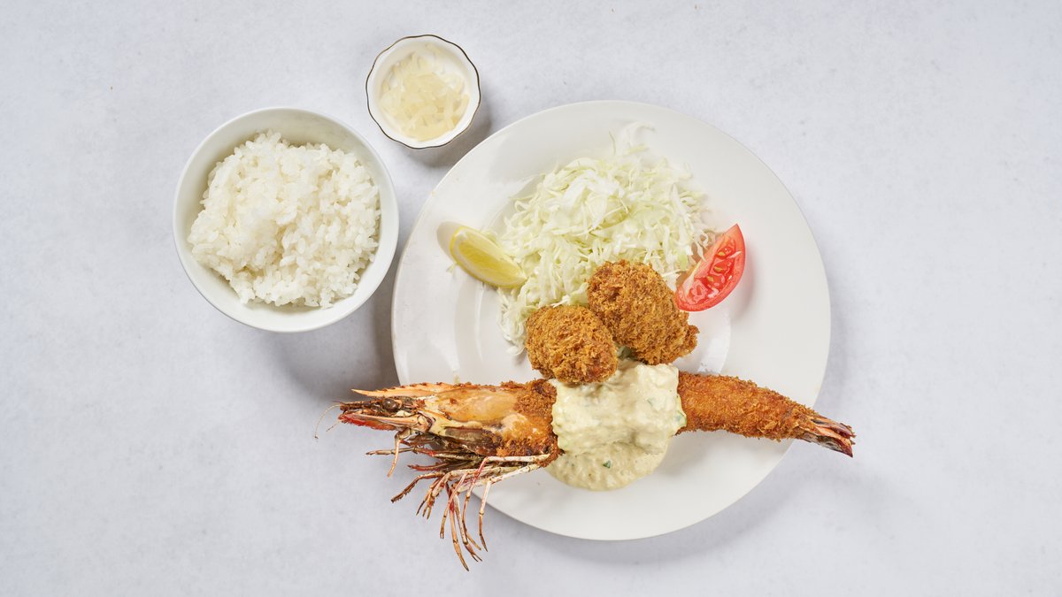 希少価値の高い大型の有頭シータイガーを使用したエビフライと、赤エビのガラから抽出したエビソースとクリームを混ぜ合わせたコロッケのセットです。 エビフライ1尾とエビ入りクリームコロッケ、ご飯・サラダ・漬物がつきます。