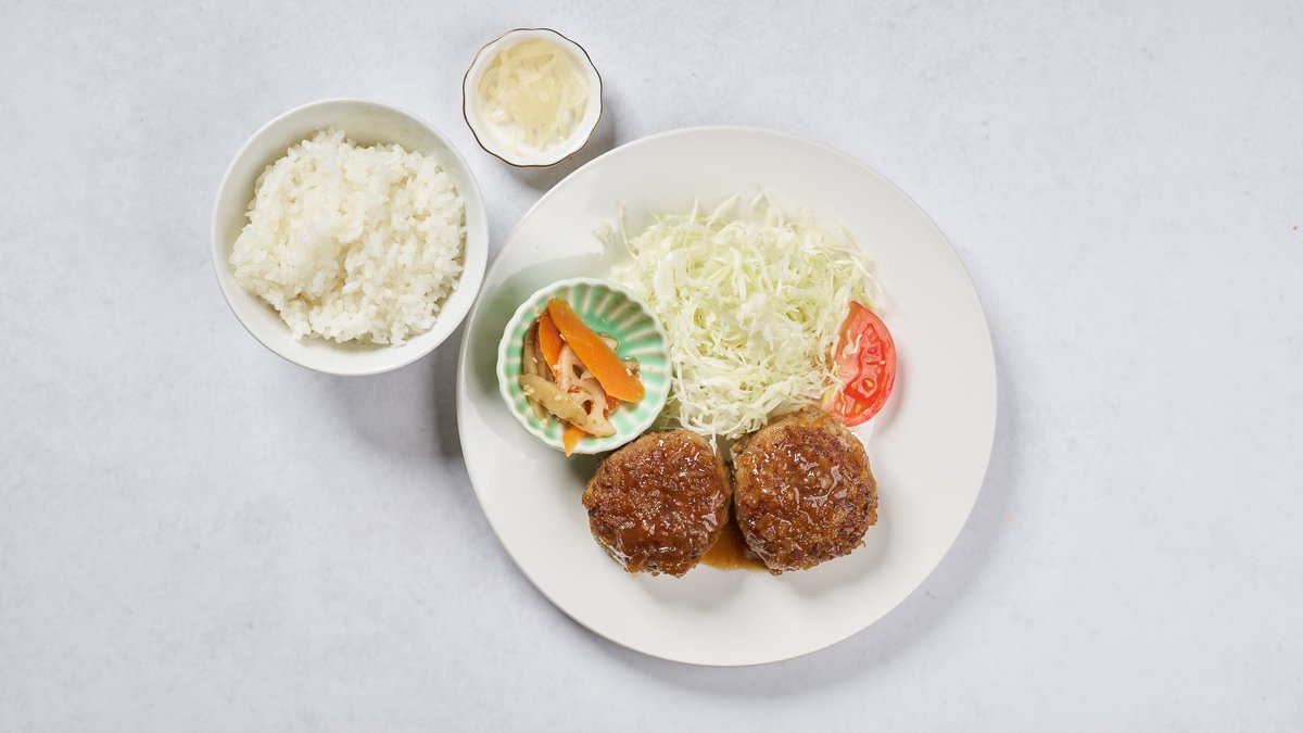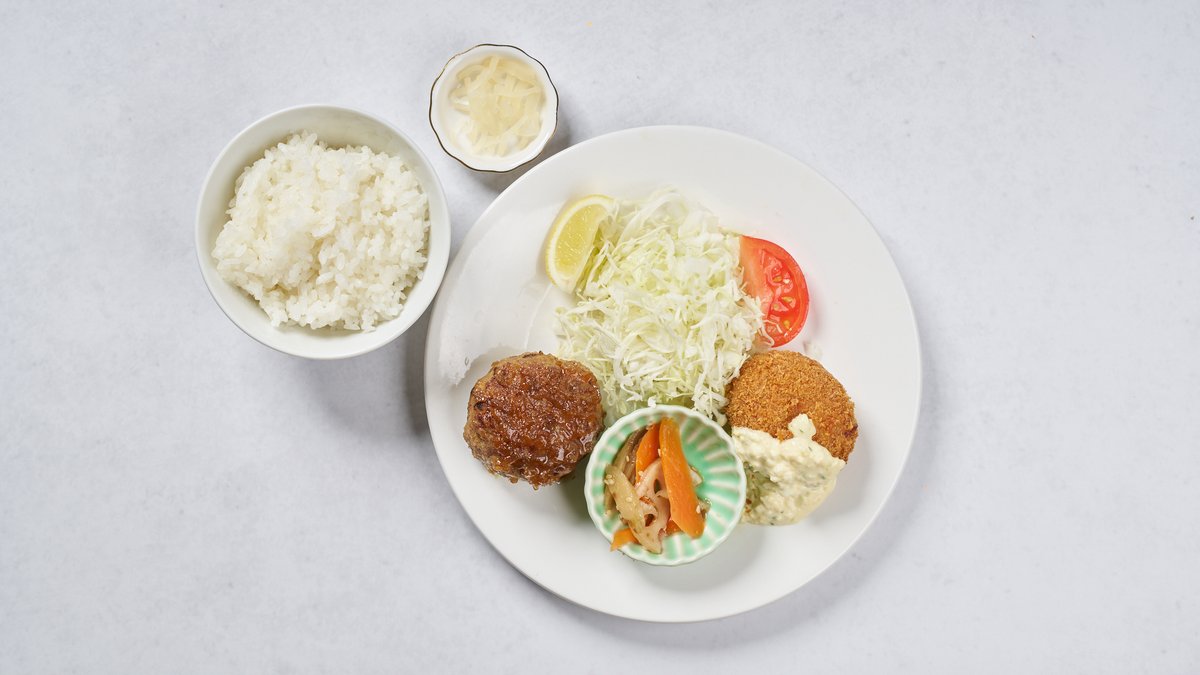 赤エビのガラから抽出したエビソースとクリームを混ぜ合わせたコロッケと、あらびきハンバーグのセットです。 メインのエビクリームコロッケと、ご飯・サラダ・漬物がつきます。