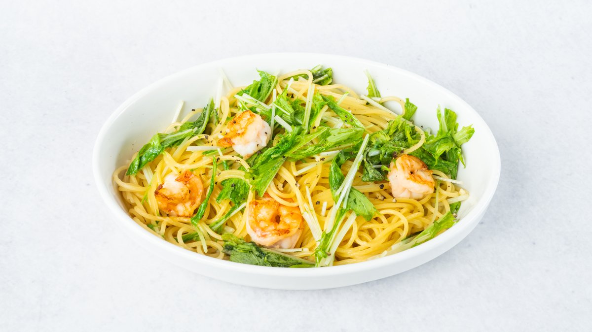 プリプリの海老とシャキシャキの水菜がたっぷり入った、さっぱりとしたオイルベースのパスタ。