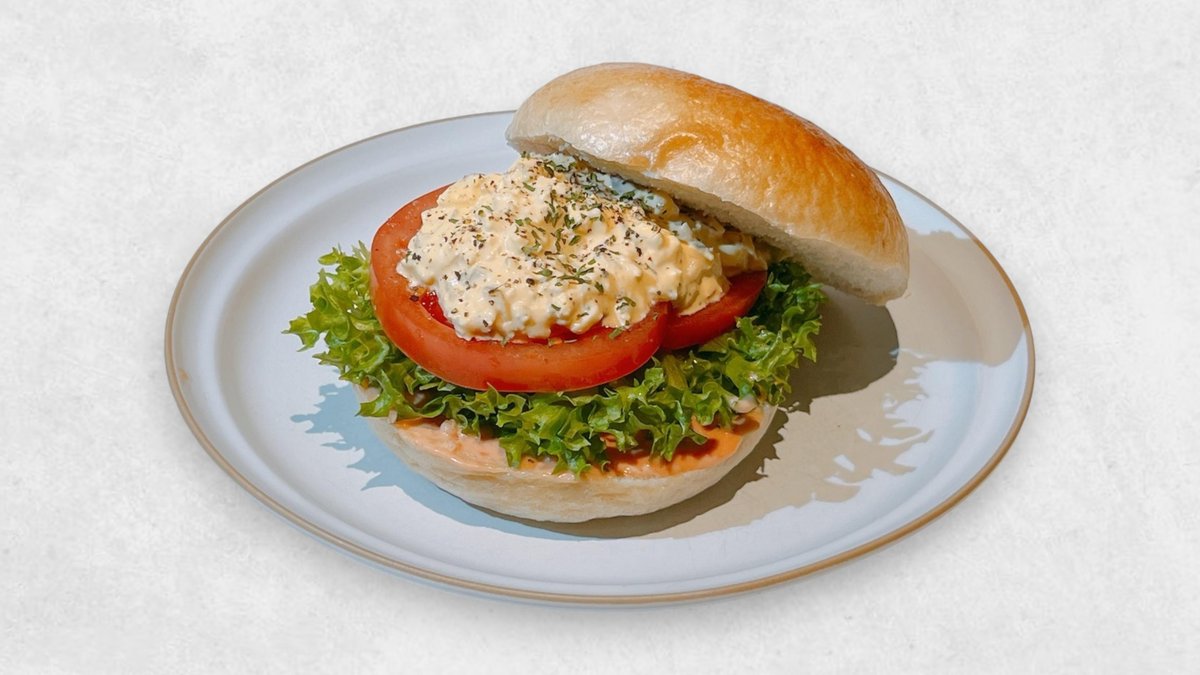 エッグタルタルとトマトスライス、オーロラソースをかけたシンプルなベーグルサンド。