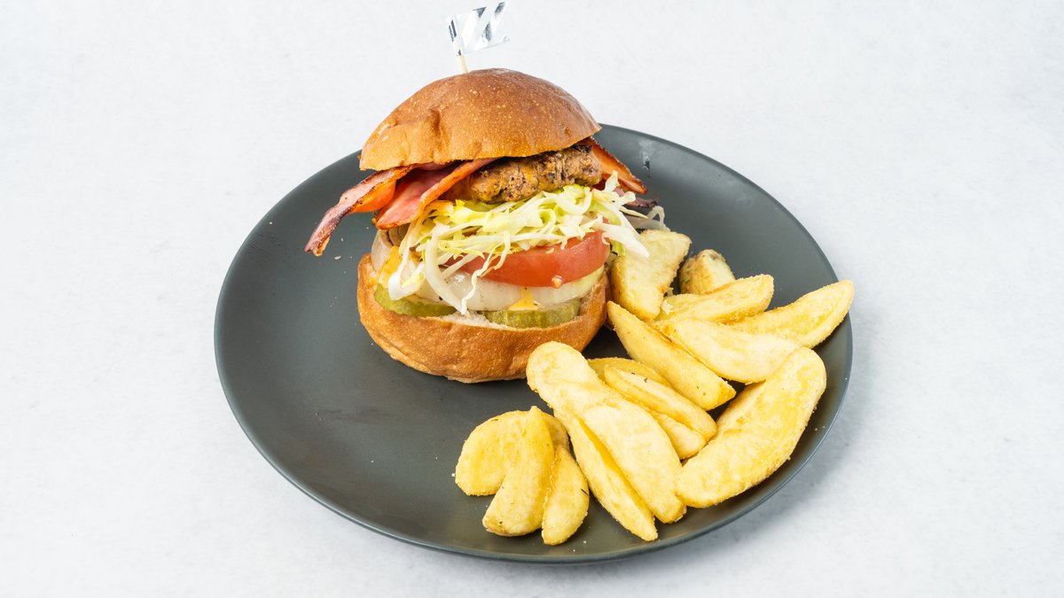 パティ、オニオン、ピクルス、トマト、レタス、ベーコン ※フレンチフライ付き