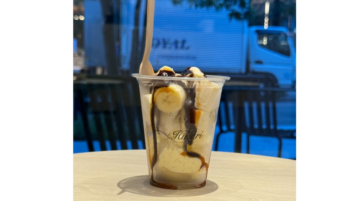 ひかりカフェで人気のある濃厚なバニラアイスとフレッシュなバナナをチョコソースソースをかけてお召し上がりください。