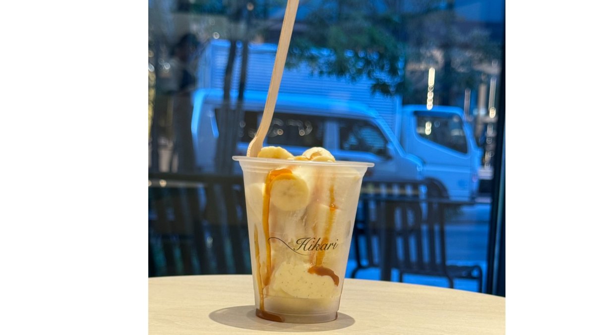 ひかりカフェで人気のある濃厚なバニラアイスとフレッシュなバナナをキャラメルソースをかけてお召し上がりください。
