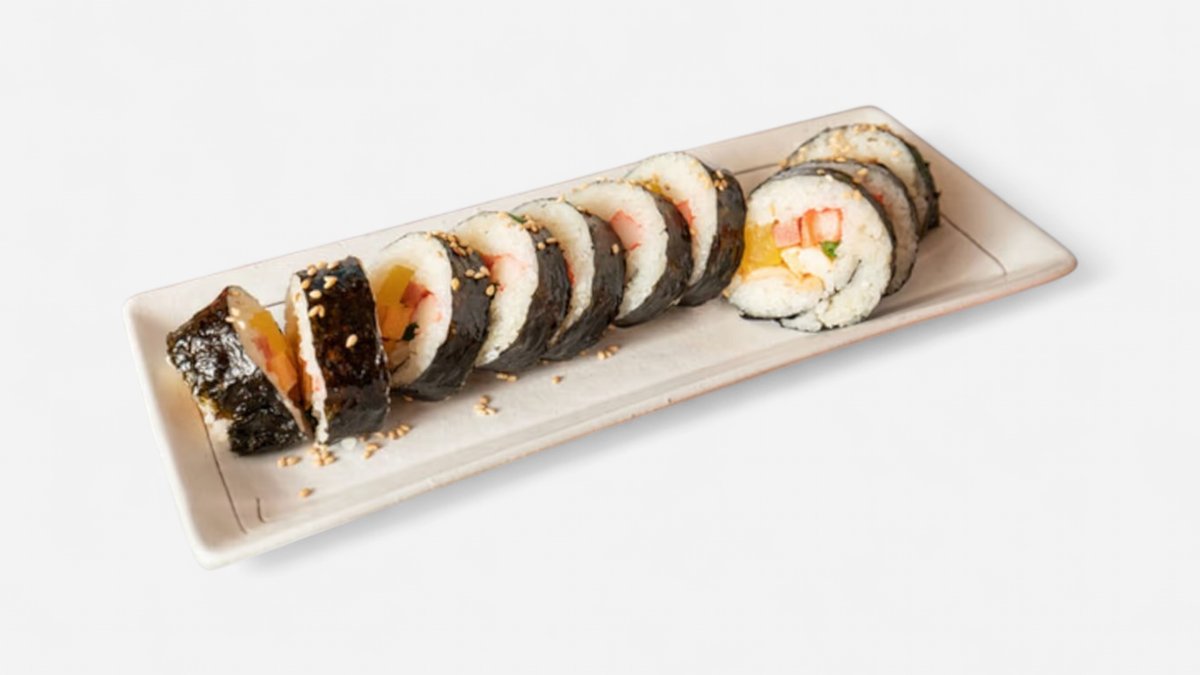 ごま油で味付けしたごはんに、ハム・かにかま・たくあん・韓国おでん・小松菜などを巻いた、具だくさんの韓国風のり巻きです。原材料:米飯、ハム、かに釜、酢大根、韓国おでん、小松菜、卵。 Korean-style rolled sushi. White rice seasoned with sesame oil instead of vinegared rice, Korean snack wrapped with ham, crab, pickled daikon radish, Korean oden, Japanese mustard spinach, and egg.※写真はイメージです。実際の商品と多少異なる場合がございます。
