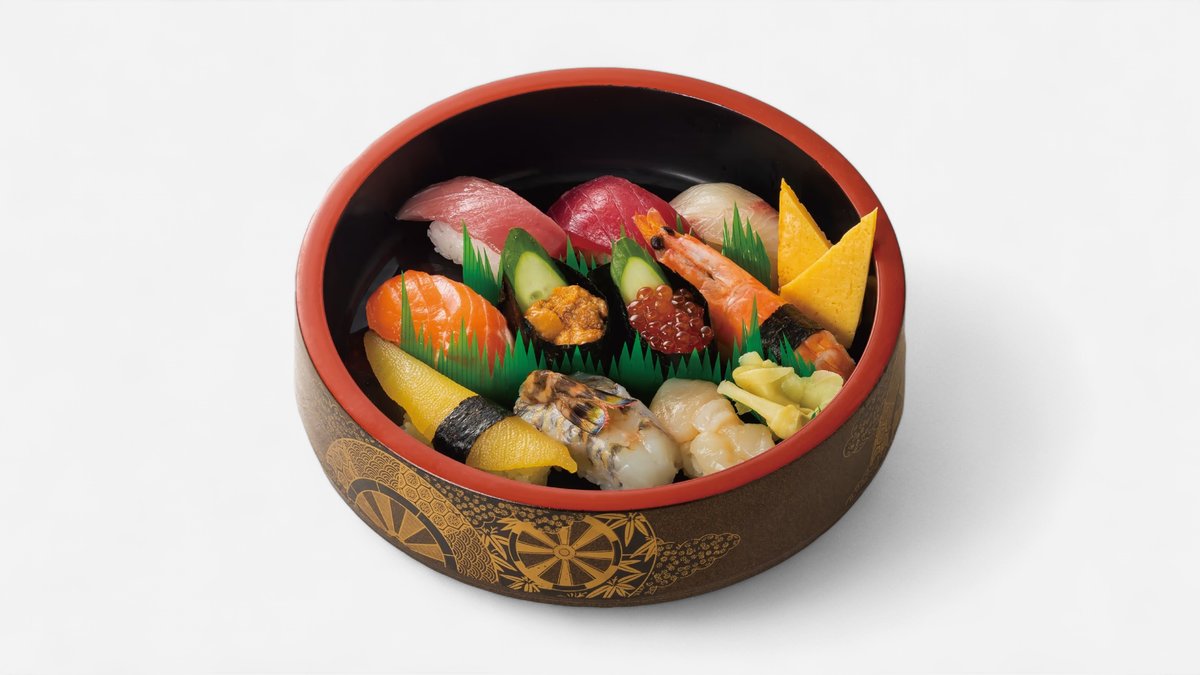 <内容> 本マグロ中とろ・カンパチ・マグロ・カニ・ウニ・イクラ・有頭エビ・穴子・ホタテ・生サーモン・飾り玉子
