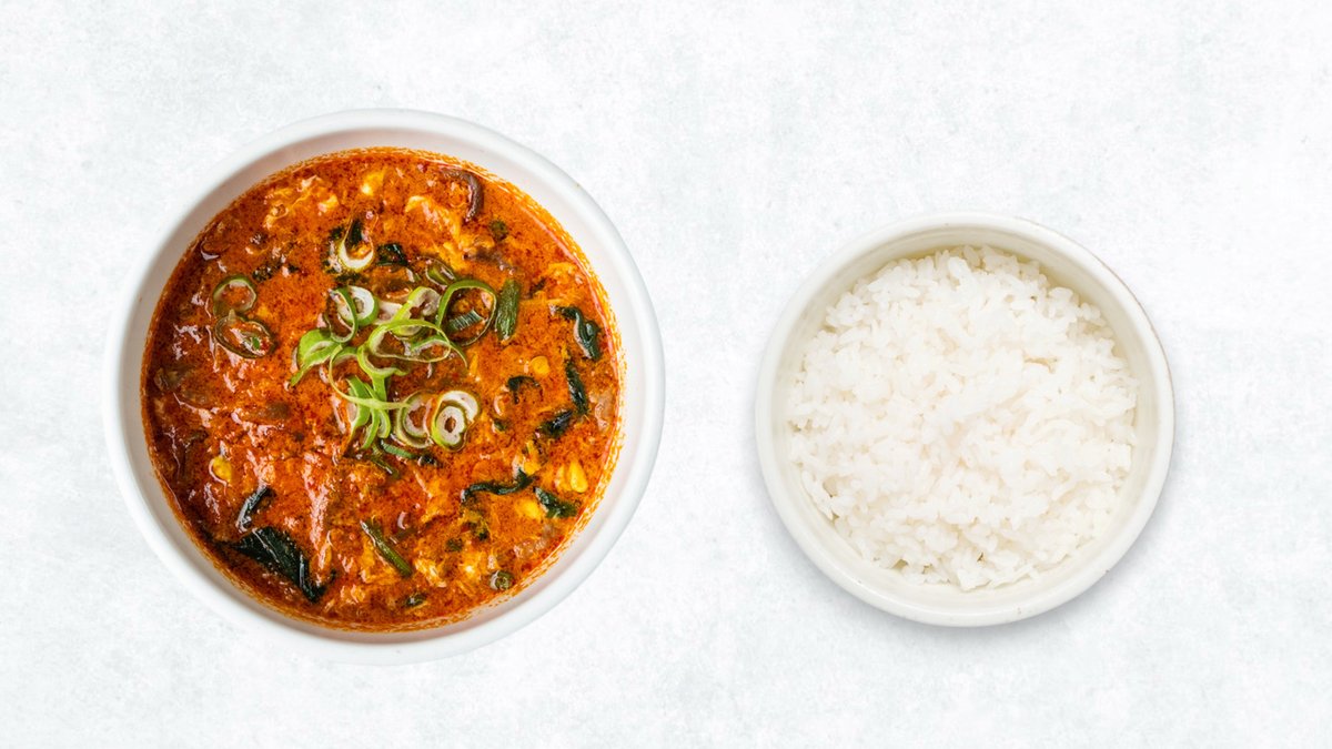 ご飯付きです。旨味たっぷりの豚肉とシャキッとしたキムチを贅沢に使い、コクと辛味が絶妙に溶け合ったピリ辛スープ。ひと口食べれば、箸が止まらなくなる美味しさです!