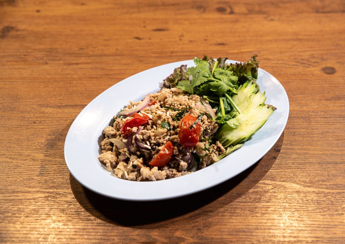 豚肉を、唐辛子や野菜と一緒に混ぜ、ライムやナンプラーで味付けをしたサラダ。ラープ自体はラオスの代表的な料理(ラオス語で幸運)で、ラープムーはラオスの影響を強く受けているタイ東北部イサーン地方でも一般的な料理です。