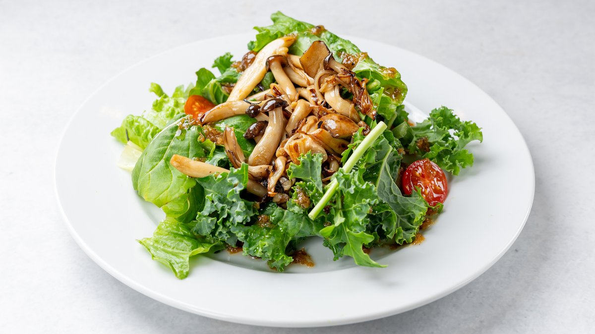 長野県産のきのこをソテーし、特製醤油ダレで香ばしく味付け。 自家製の焼き玉ねぎドレッシングとの相性は抜群です!