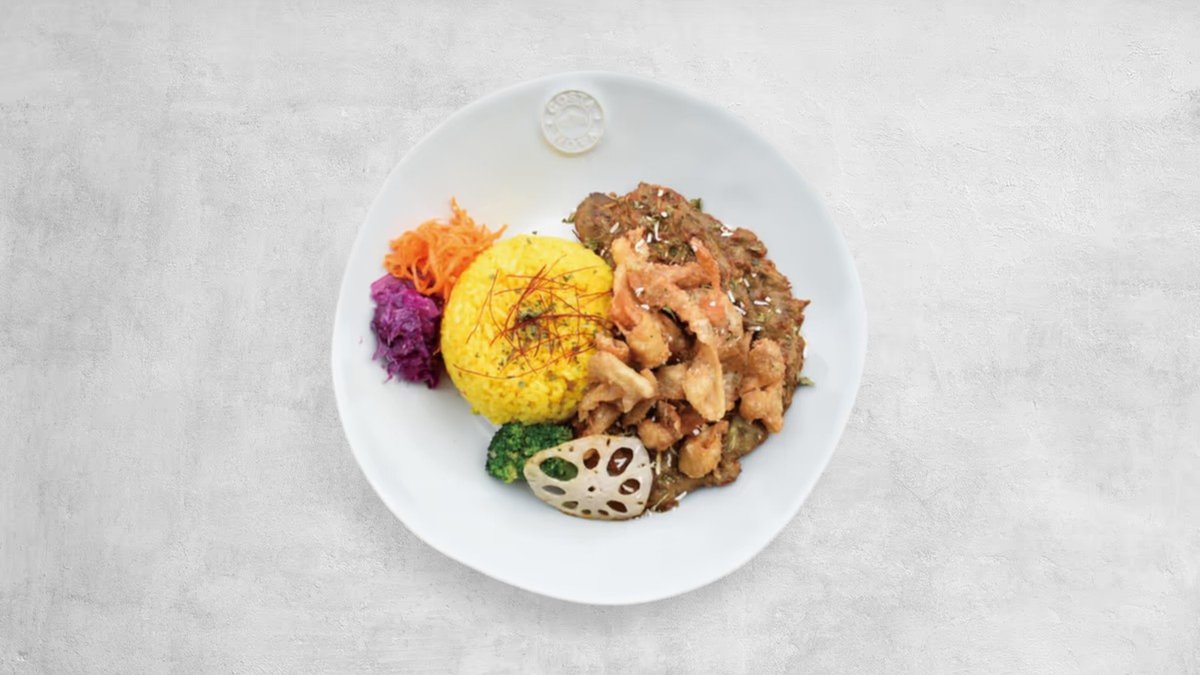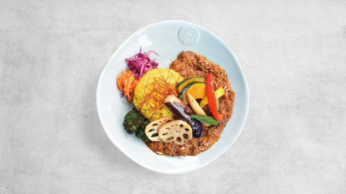 無水チキンカレーに揚げた野菜をトッピング!ブロッコリーやレンコンをはじめ、ナス、オクラ、パプリカ、かぼちゃを素揚げして入れました。