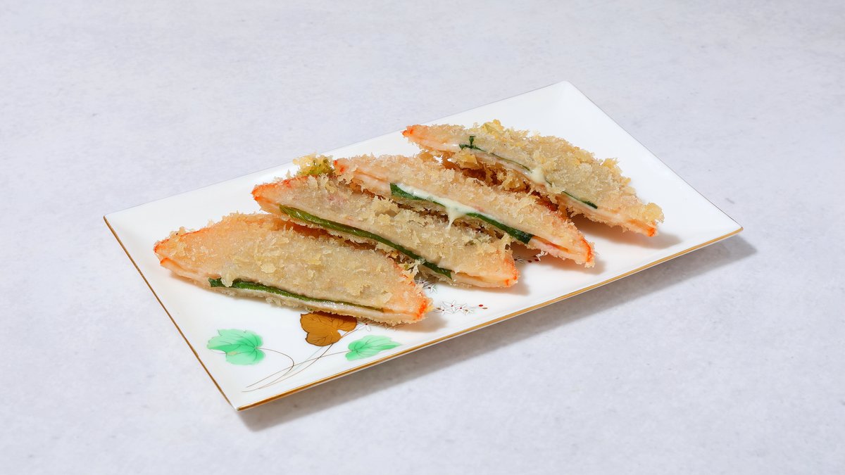 ハムカツと言えば厚切りが王道ですが当店は薄切りハムでチーズと大葉をサンド!シンプルにそのままが美味◎