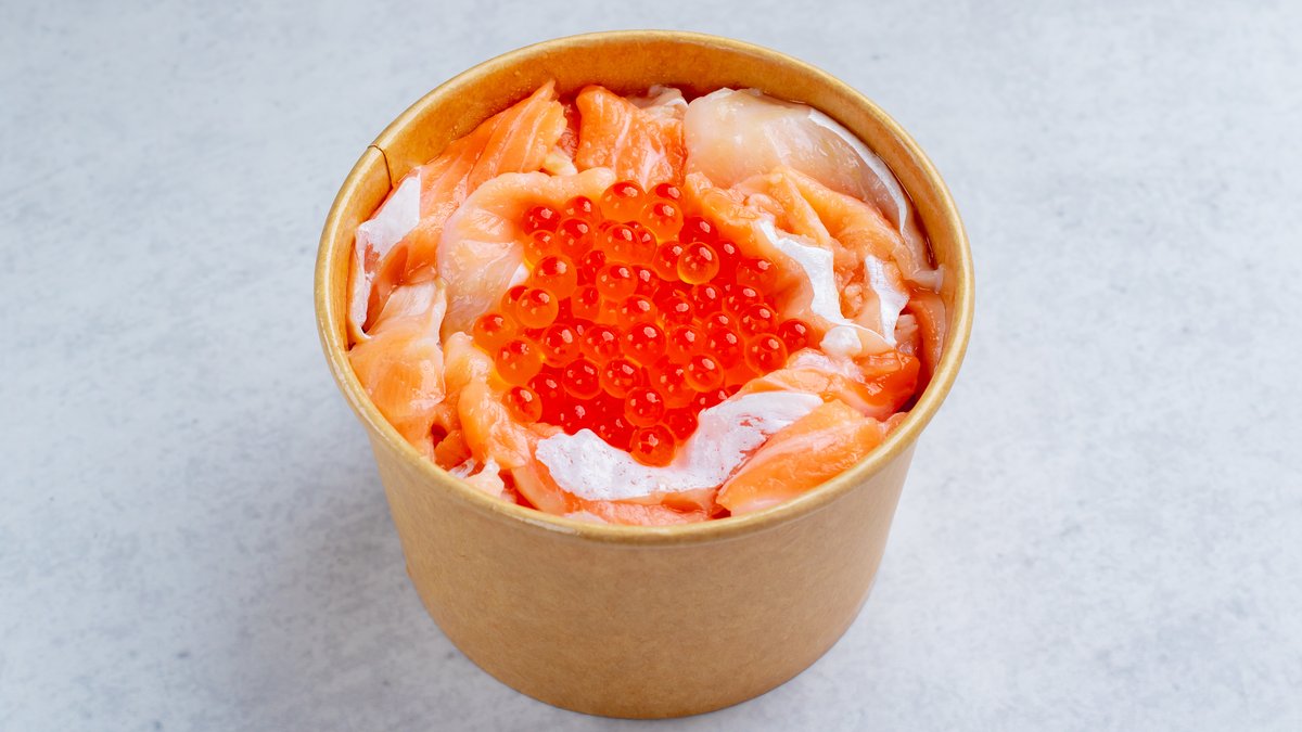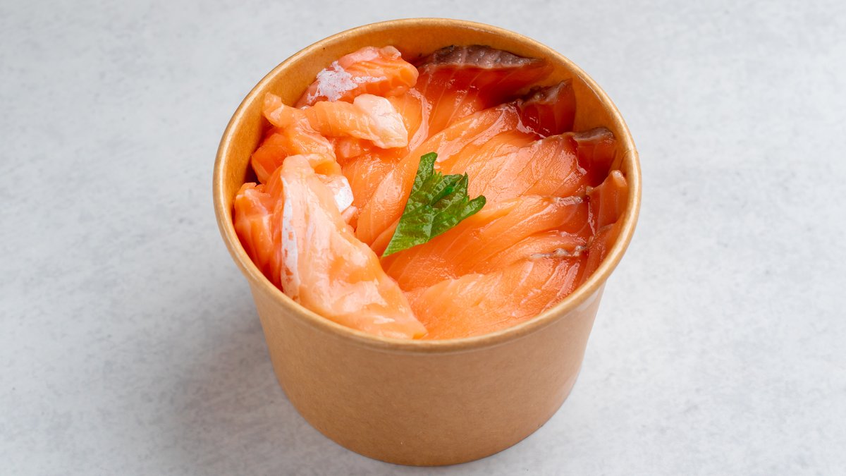 サーモンとサーモンハラスがたっぷり入った正にサーモンまにあ!! ※ハーフ丼2つとザンギ2個がセットでの提供となっています。 サーモンまにあ丼ともう一つ丼が選べます。