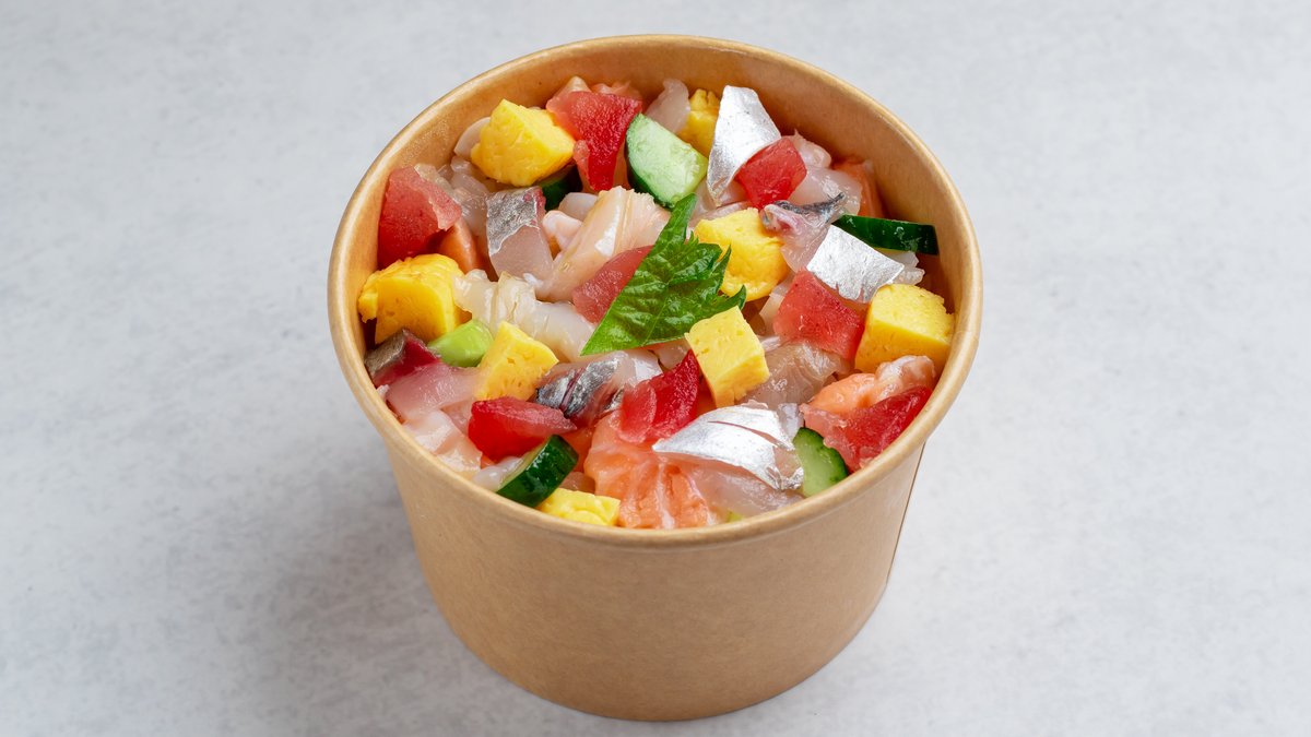 まぐろの赤身、脂ののったサーモンハラス、鯵、つぶ、玉子焼き、きゅうり、おすすめのネタ、7種類の具材の海鮮ちらし丼です。 ※ハーフ丼2つとザンギ2個がセットでの提供となっています。 店主の気まぐれ海鮮丼ともう一つ丼が選べます。