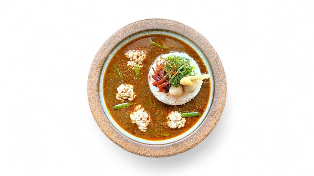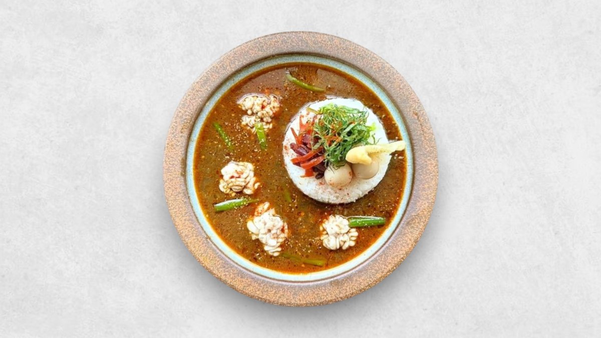 旬の真だちのクリーミーで濃厚な旨み、にんにくの芽の食感や香り、自家製コチュジャンや黒胡麻のコクと旨味が絶妙に調和する。 4、5種類の副菜とカレーを混ぜながら 変化する味わいもお楽しみください。 (副菜は季節や仕入れにより変わります)