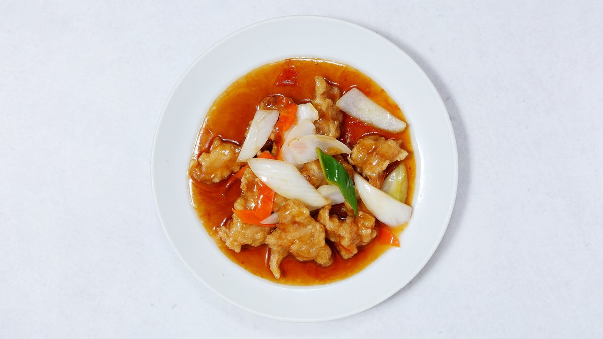 鶏肉をカリッと揚げて特製の甘酢ソースで炒めた料理。