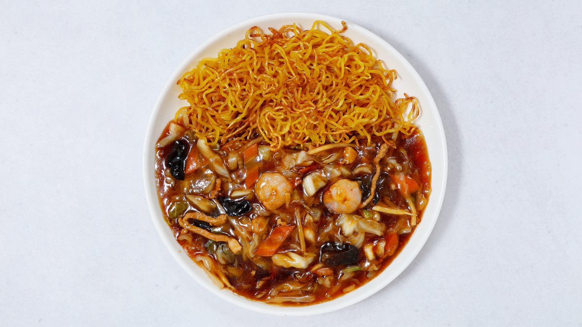 ソースで絡めた焼きそばをあんかけソースで覆った中華料理。