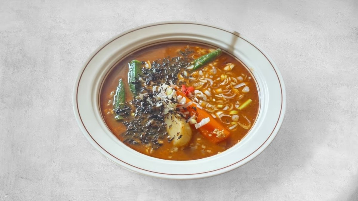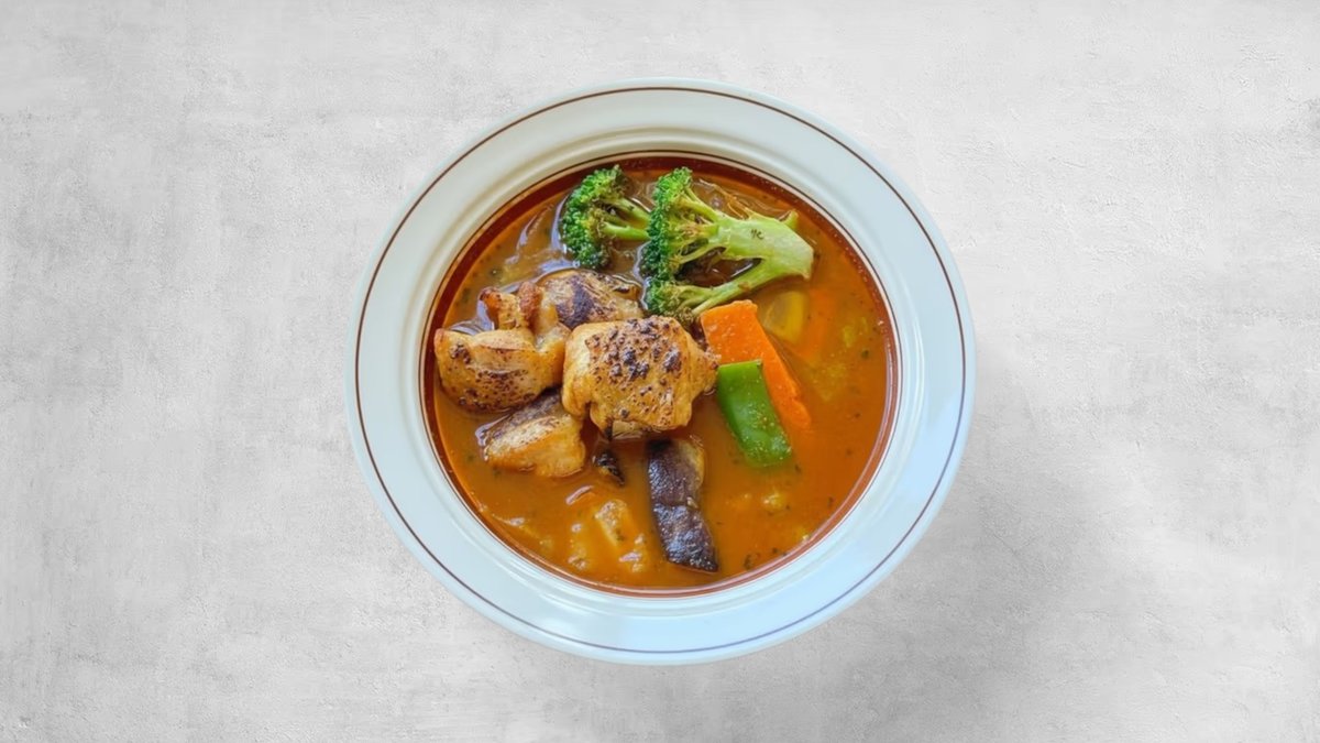 スープカレーといえばコレ、という定番の一品♪ 素揚げ野菜の香ばしさとスープのやさしい旨みが調和する、定番にして完成形。 ホロっとほぐれるチキンも存在感抜群。 大盛りライス&ジャンギ2個付きなら、ヘルシーなのに満足度MAX。