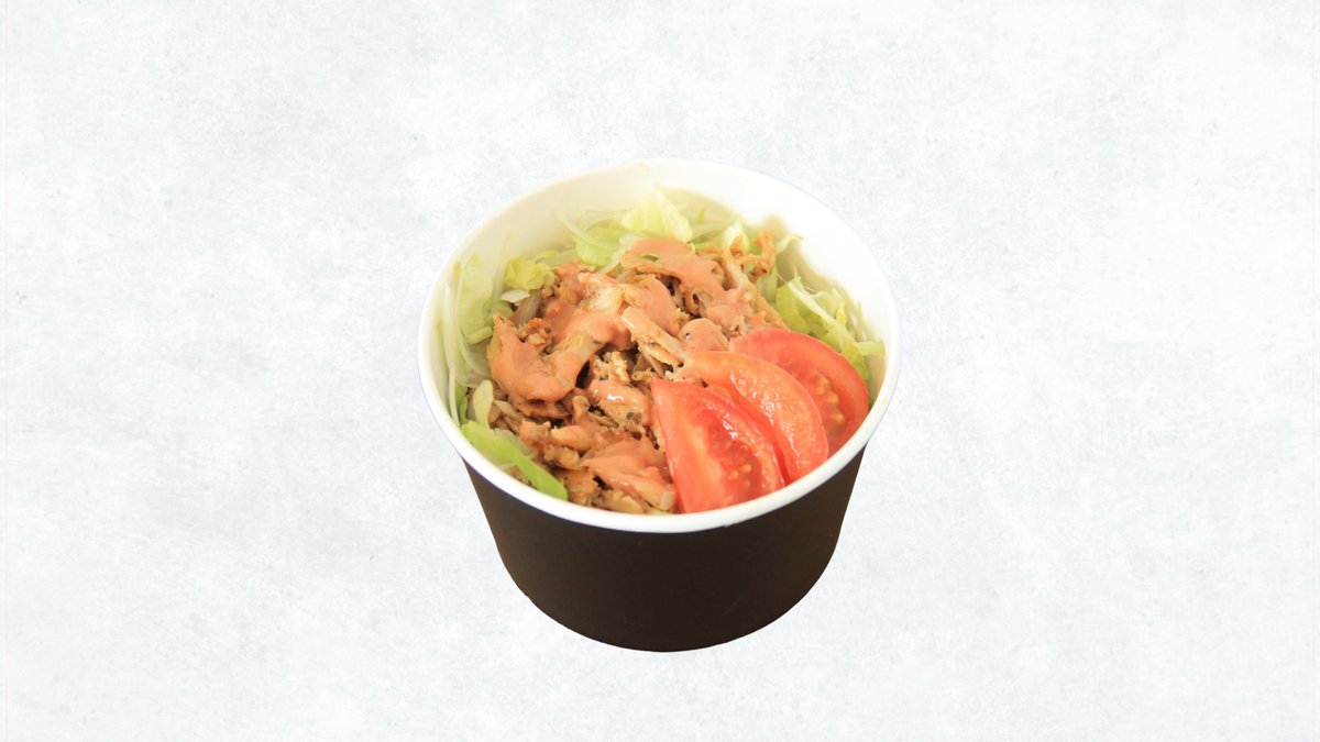ライス約250g。チキン約80g。香ばしく焼き上げたケバブに甘辛てりやきソースを合わせた、旨みたっぷりの丼です。 写真はオーロラソースです。