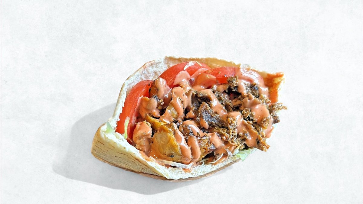 チキンとビーフを組み合わせ、爽やかなレモンペッパーで仕上げた風味豊かなミックスケバブです。画像はオーロラソース