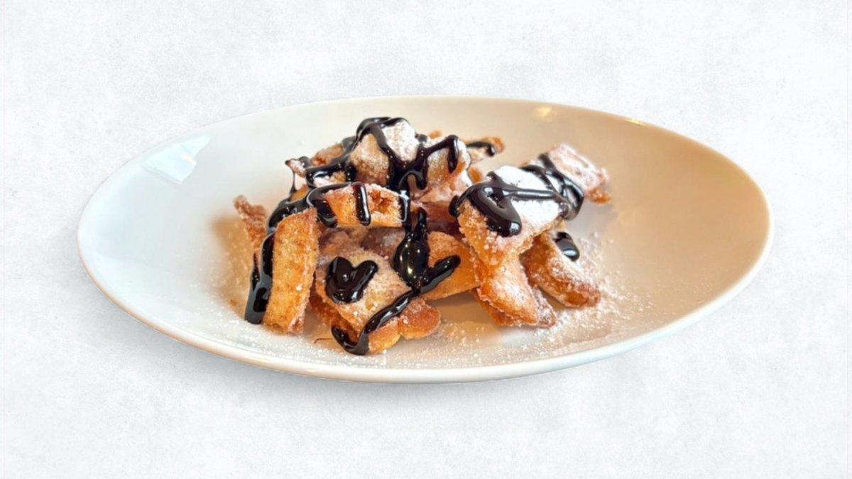 ピタパンをサクッと揚げたスイーツ感覚。スノーシュガーとチョコソースがかかっています