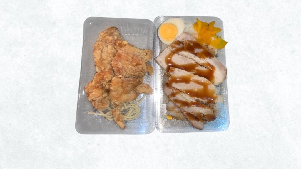 自慢のジューシー唐揚げと人気のチャーシューを同時に味わえる満足度の高いお弁当です。唐揚げによく合う味変メニューもお楽しみください。