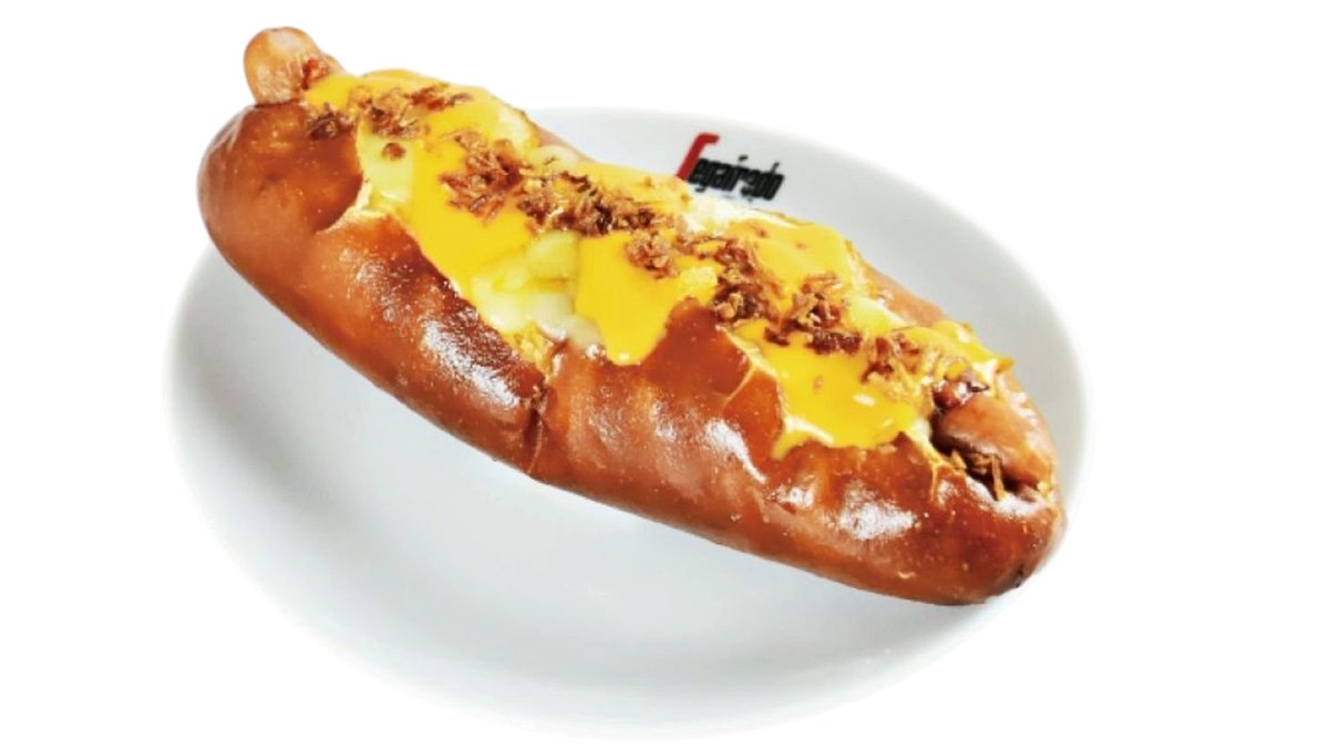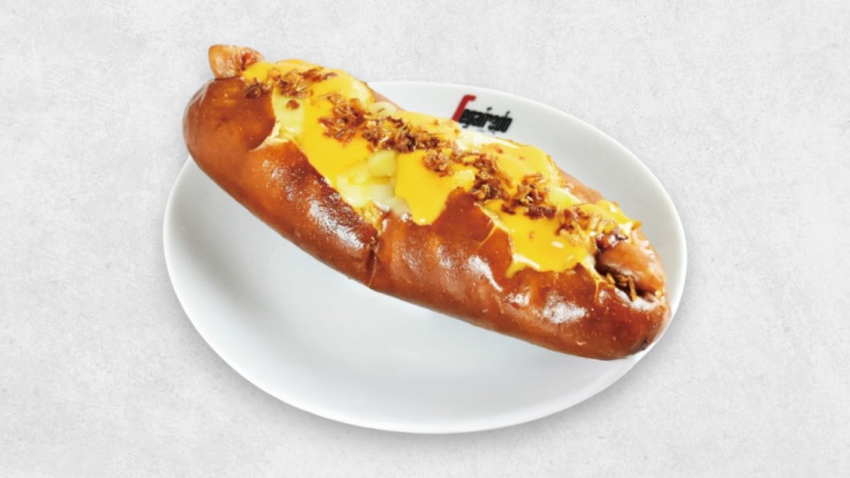 芳ばしい風味のプレッツェルバンズにスパイシーな特性牛肉ソース、3種のチーズがとろけるホットドッグ!