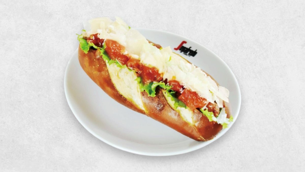 芳ばしい風味のプレッツェルバンズにトマトマリネ、パルミジャーノレッジャーノD.O.Pを使用した贅沢なホットドッグ!