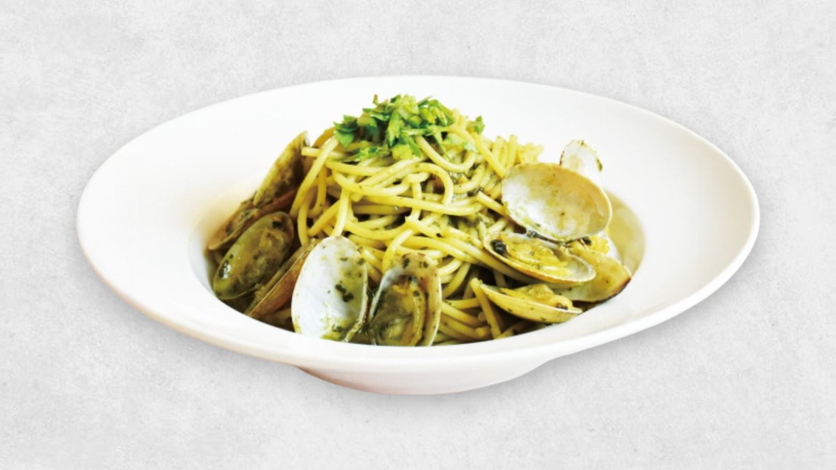 アサリのうまみと特性魚介ソースが入ったオーリオパスタ。ほのかに香るバジルが特徴。