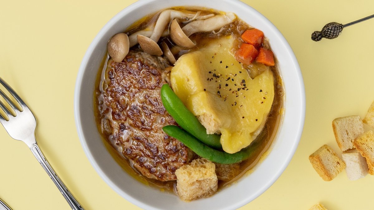 栄養価の高いハンバーグとたっぷりの玉ねぎを、ヘルシーにあっさりお召し上がりいただけます。「オニオングラタンスープ + ハンバーグ」の斬新なメニュー。血液をサラサラにする効能がございます。