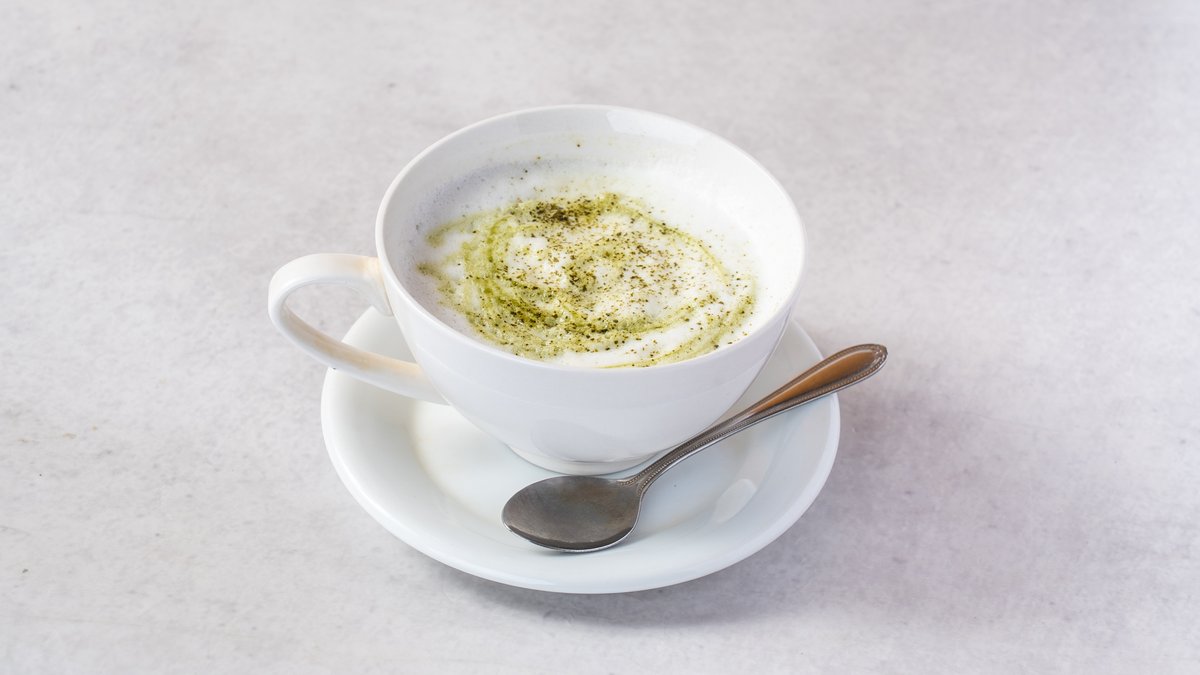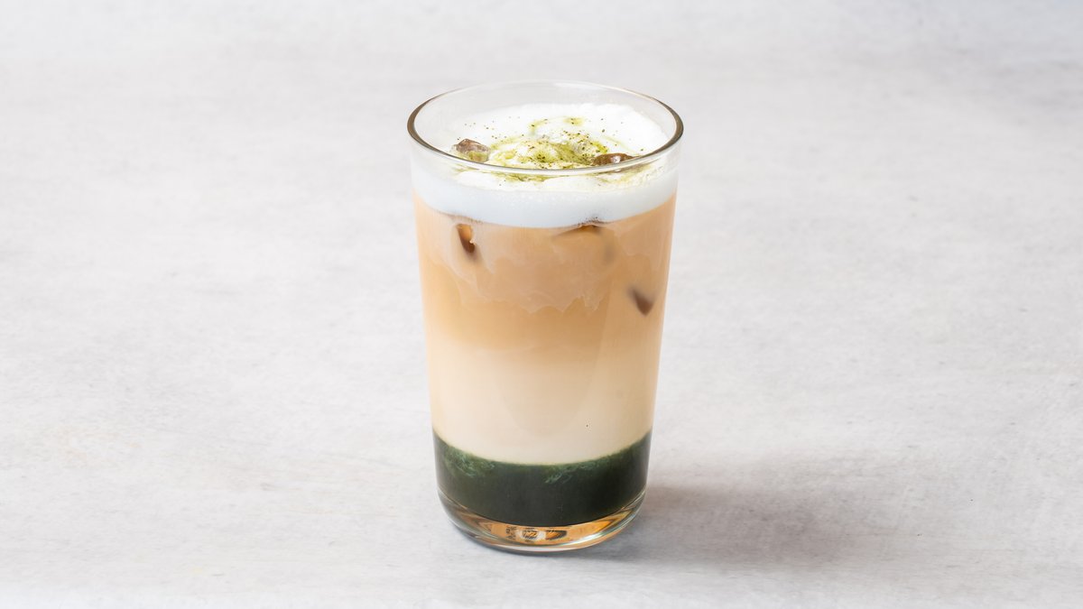 ほろ苦い抹茶とミルクが絶妙にマッチしたラテです。 A latte with the bittersweet matcha and milk matching perfectly.