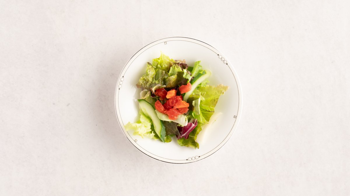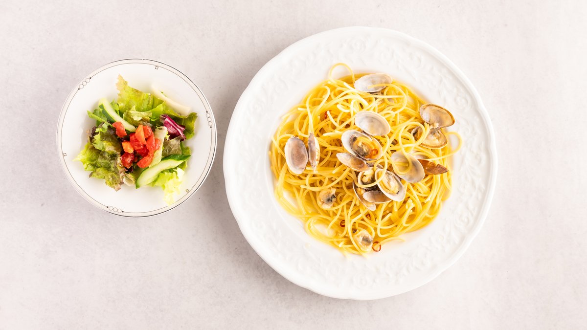 ニンニクがきいた塩味のパスタです。サラダは自家製ドレッシングをかけて提供いたします。※写真はイメージです。