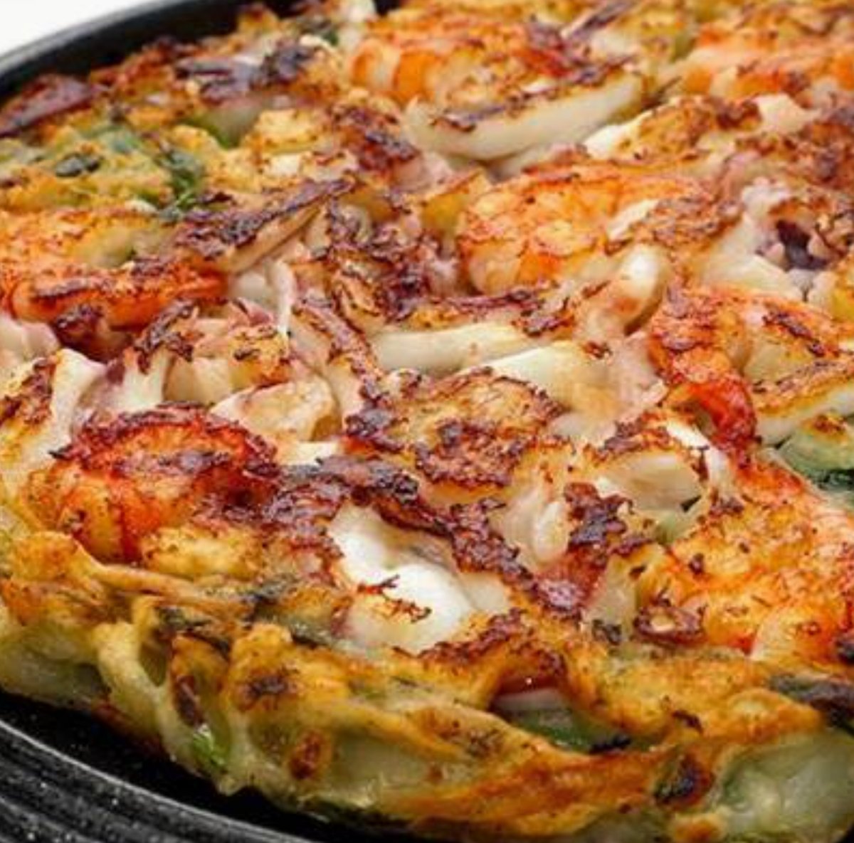 海鮮がたっぷりの香ばしいサクサクチヂミです。