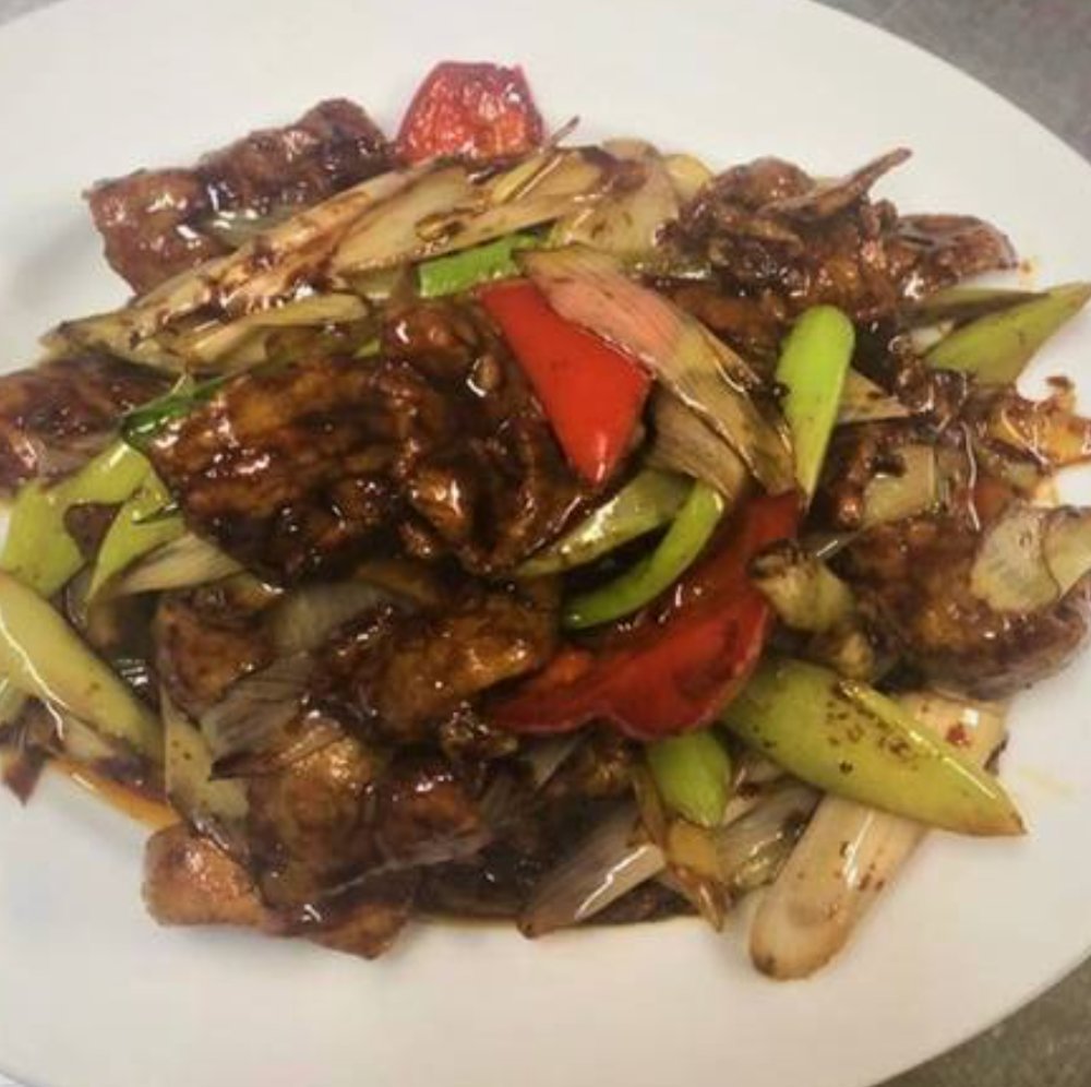美味しく料理されたネギと豚肉の炒め物はいかがですか?