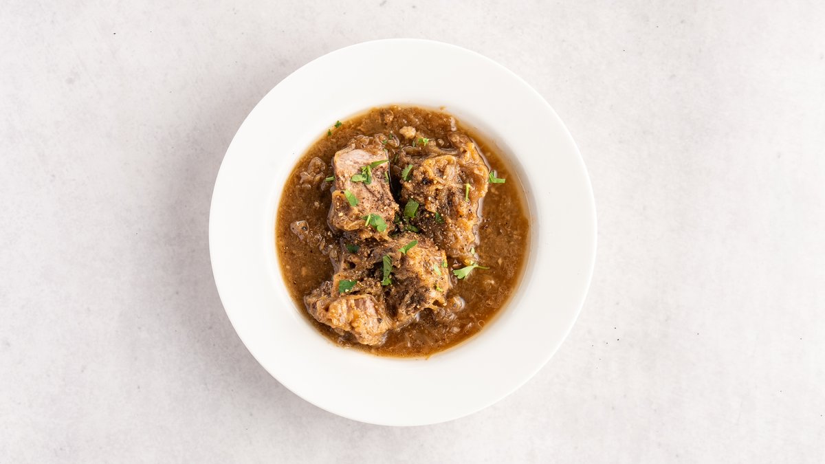豚肩ロースと玉葱をフォークで裂ける程柔らかく煮込みました 肉の旨味とじっくり煮込んだ玉葱のソースが最高です ストラクチャーのしっかりとした白ワインがベストマッチです。
