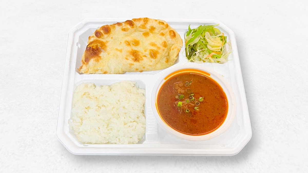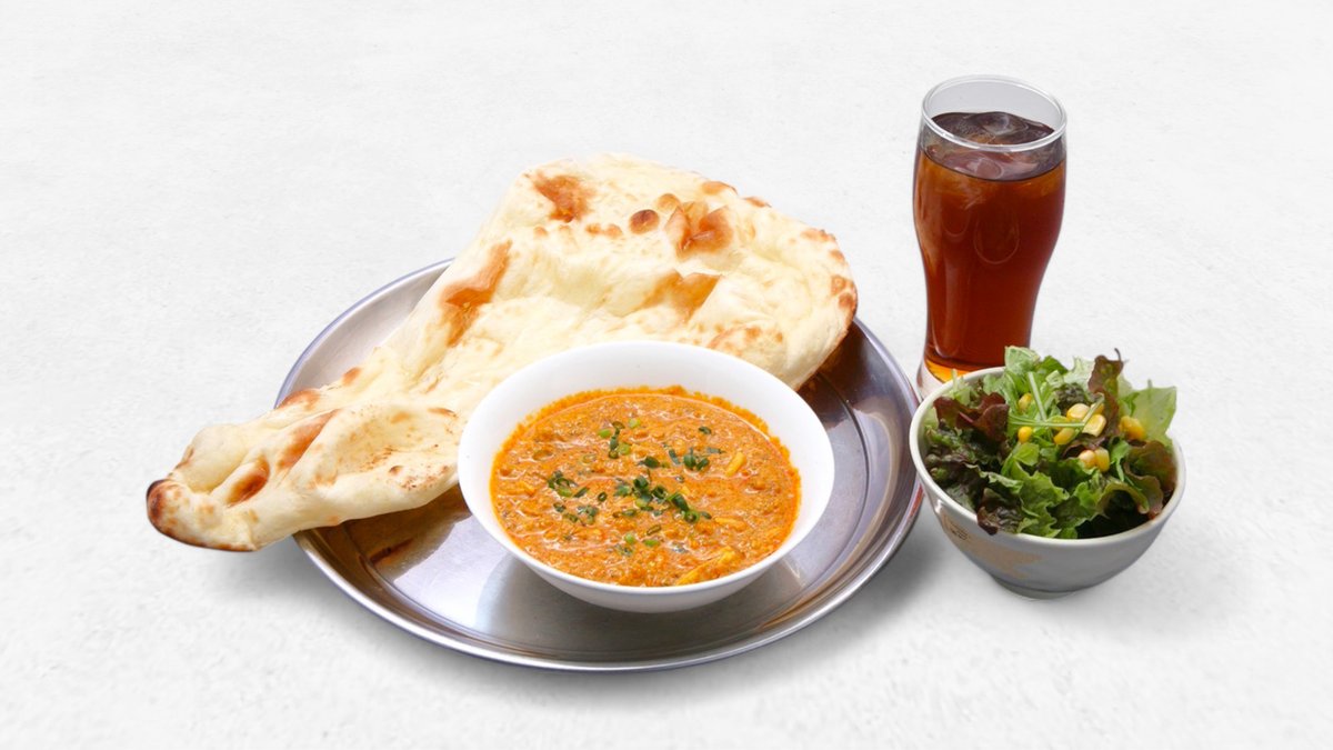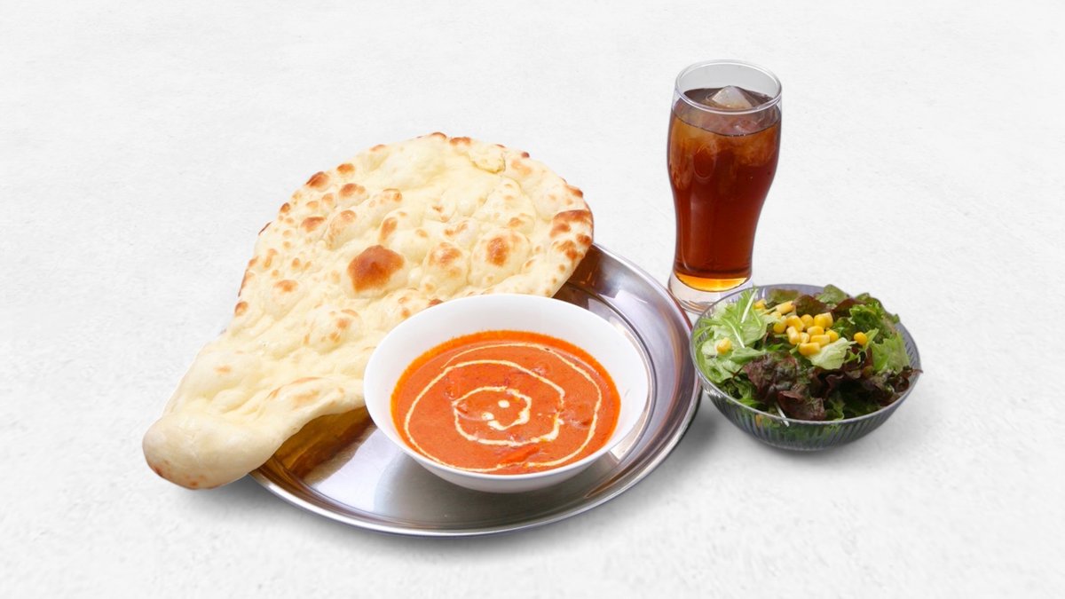 クリーミーでまろやかなバターチキンカレレーとナンorライス、サラダ、ドリンクのセットです。トマトの酸味とバターのコクが効いた濃厚なルーがチキンの旨味を引き立てます。