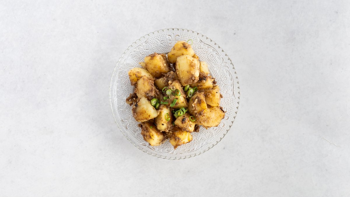 じゃがいもをクミンシードなどでシンプルに炒めた、風味豊かなインドの家庭料理です。カレーともよく合います。/ A flavorful Indian home-style dish of potatoes simply stir-fried with cumin seeds and other spices. It pairs excellently with curry.